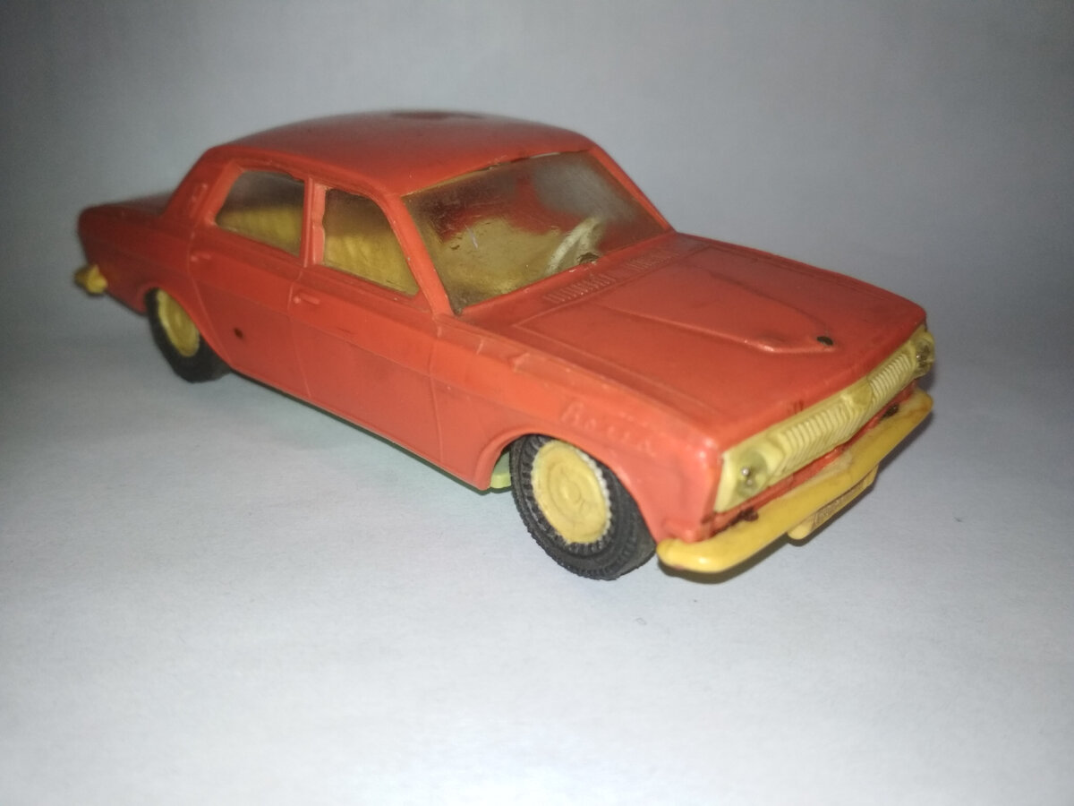 Около полугода назад мне отдали игрушечную Волгу. Эта машинка выпускалась с 1973 по 1991 годы в Одессе на предприятии «Черноморская игрушка». Машинка выполнена из пластика, исключение составляют только покрышки из резины и оси из стали. Несмотря на то, что это игрушка, в 43-й масштаб она попадает. На фото видно, что игрушка находится в плачевном состоянии. Судя по всему, она выпушена ближе к концу производства, как следствие, имеет множество «врожденных» дефектов. Кузов отлит на изношенных формах, поэтому на нем неаккуратные кромки стёкол, деформированное левое переднее крыло и многое другое. Кроме того, судя по фотографиям этих машинок, выгнутое донышко присутствует на многих экземплярах. Кроме дефектов, полученных при производстве, были и приобретенные. Самый заметный из них, это гвоздь и шуруп, которыми кто-то прикрепил донышко к кузову, сделано это было варварским способом – нагретые железки воткнули в кузов так, что они прошли через крышки капота и багажника насквозь. Кроме того,