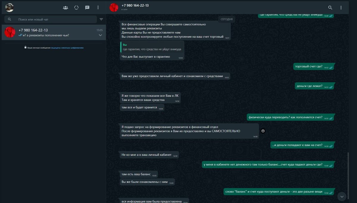 Еще один псевдо-брокер TradingProInvest. Заманивают через рекламу в ВК, якобы получить 5000 бесплатных цифровых рублей. Это, видимо, новый тренд. После указания своего телефона перезванивают с телефона 89291431684, потом весь диалог ведется в WhatsApp (тел.79801642213) Суть всего этого заключается в том, для того чтобы воспользоваться подаренными 5000 руб. надо пополнить депозит их платформы на такую же сумму. Спрашиваю про сохранность денег, они говорят, что деньги хранятся на их платформе и никуда не денуться. Ага! Естественно, после этого ничего не увидел бы на своем счету. В переписке в Ватсапе постоянно путалась в показаниях (отвечала то он, она), в конце вообще перешел на оскорбления. Скрины переписки есть ниже. Посмотрите :)