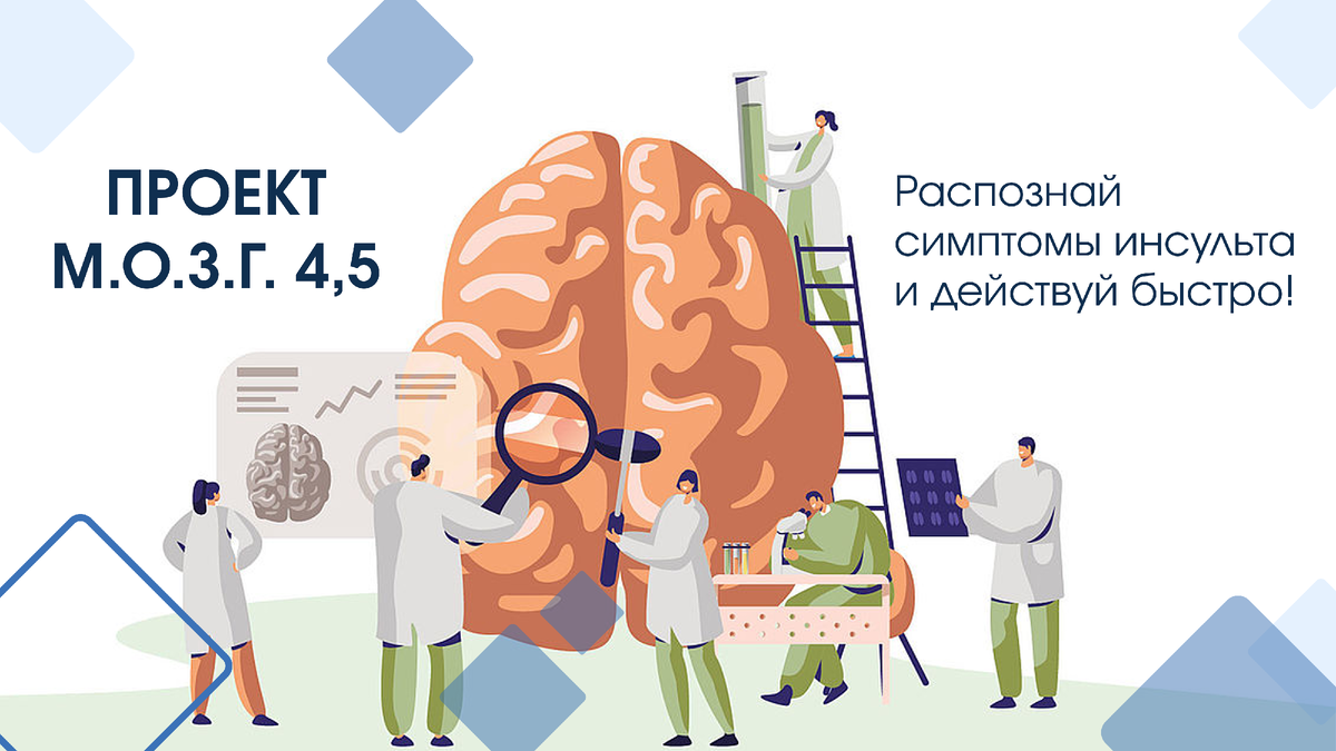«М.О.З.Г. 4,5» — это всероссийская информационная кампания, рассказывающая взрослым и детям о самых ранних симптомах инсульта и способах помощи человеку с этими симптомами. Проект, инициатором которого выступил АНО «ИнфоЗОЖ», уже поддержали Минобрнауки и образовательные организации по всей стране. Одна из ведущих причин заболеваемости, инвалидизации и смертности в России — это сосудистые заболевания головного мозга. Четверть летальных исходов в год в стране обусловлено именно этой болезнью. Название проекта — «М.О.З.Г. 4,5» — это сокращение, которое напоминает о ключевых симптомах инсульта и времени, которое у нас есть для помощи больного. Каждая его буква расшифровывается одним из симптомов инсульта. М — мимика нарушена О — ослабли руки или ноги З — затруднена речь Г — главное — успеть вызвать Скорую помощь по номеру 103 4,5 — время в часах, за которое нужно успеть спасти жизнь больного. Если начать помощь больному позже, это может привести к необратимой потере функций мозга и тяжел