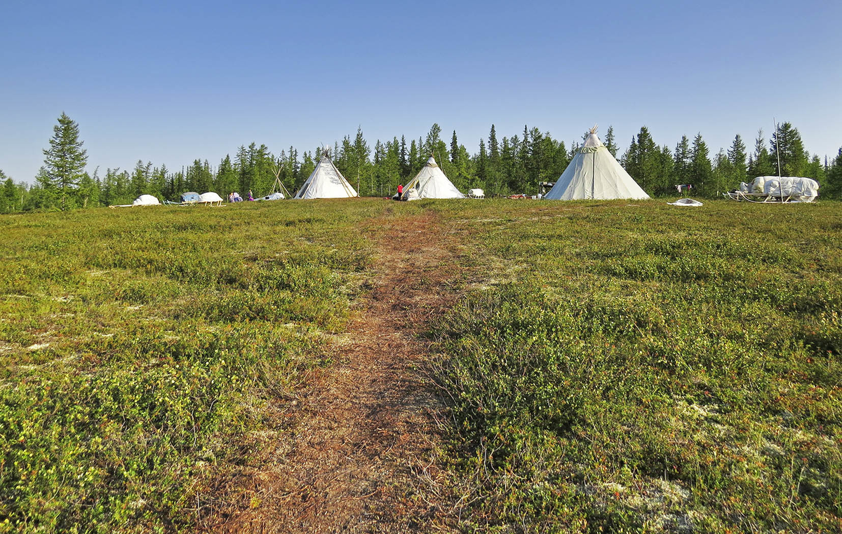 Дело даже не в том, что рядом с ним вместо нарт калданка (хантыйская лодка из 3 досок), а в материале: если ныне летние чумы кроют брезентом, то исторически мя и хот (названия чума у двух народов) отличались материалом.