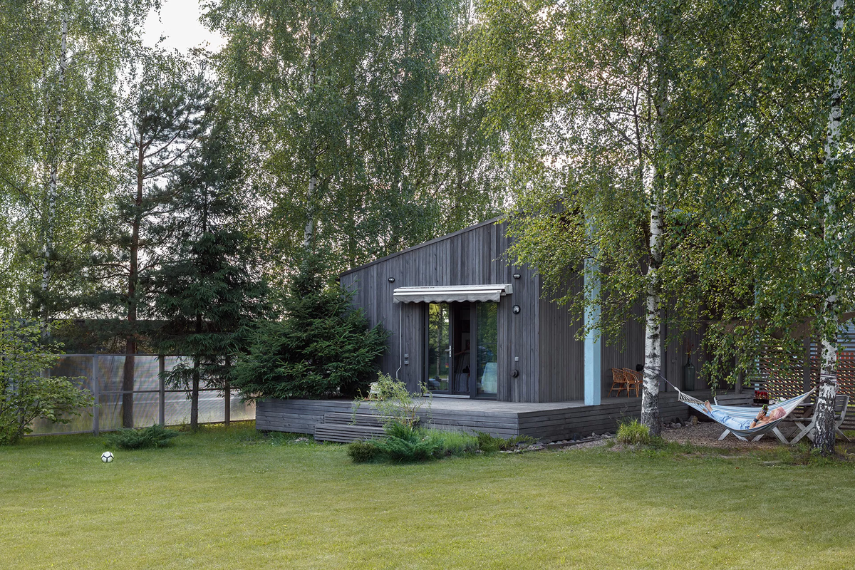 Екатерина Сванидзе спроектировала дачный дом на участке 25 соток в Ярославской области для себя и своей семьи. Территория «Архсарая» вплотную прилегает к фермерскому лугу, за которым находится лес. «Дом каркасный, фасад обшит планкеном из красноярской лиственницы, — рассказывает дизайнер. — Его площадь — 41 кв. метр. Мне хотелось, чтобы он не привлекал лишнего и внимания и был гармонично вписан в окружающий пейзаж».