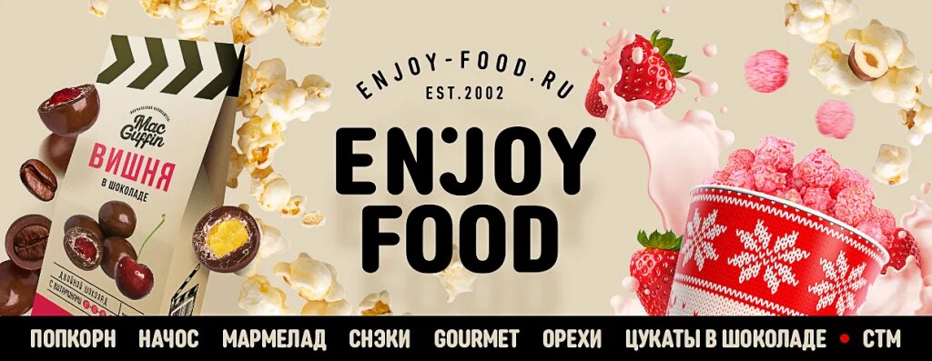 Компания Энджой Фуд предлагает ознакомиться с большим выбором премиальных десертов из кусочков фруктов, ягод, зерен кофе и орехов в шоколаде. Некоторые вкусы могут удивить даже самых изысканных гурманов, например попкорн Macguffin, политый толстым слоем белого шоколада и в кокосовой посыпке, похож на рафаэлло. Больше 10 разных видов жевательного мармелада и других снеков, которые выпускаются под собственными брендами с авторским дизайном. Macguffin Бренд со своей собственной историей создания, характером и запоминающимся дизайном. Макгаффин выделяется на фоне остальных российских изделий, которые предлагают на рынке. Все это благодаря яркому стилю оформления и большому разнообразию насыщенных вкусов продукции, которая изготавливается с соблюдением особой технологии: Для поклонников необычных вкусов в линейке имеется попкорн в стакане с черным трюфелем и морской солью с ярко выраженным ароматом грибного деликатеса. Весь наш товар обладает всеми необходимыми лицензиями и сертификатами, с
