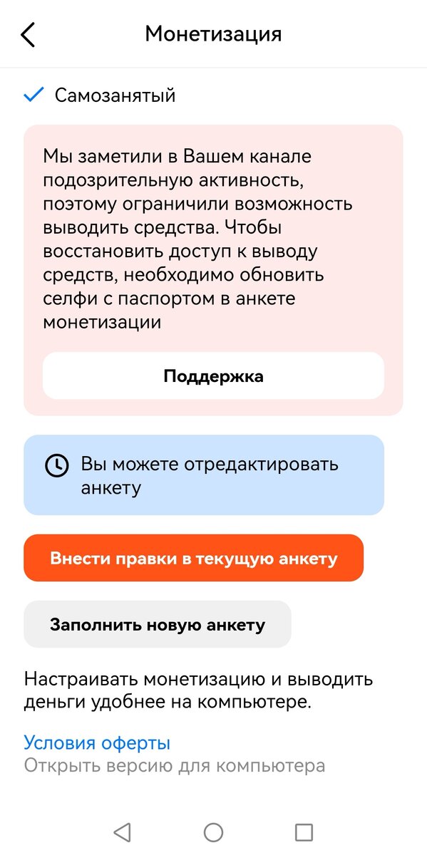 "ДЗЕЕЕЕЕЕЕН!!!!!😡🤬😡" - прооралось у меня в голове с утра, когда я попыталась вывести деньги и столкнулась с ограничением. "На вашем канале подозрительная активность, поэтому вывод средств невозможен". В чём состоит подозрительная активность? Видимо, в том, что я стала больше публиковать. Почему же я стала больше публиковать? Потому что 3 августа сменилась система монетизации, и, к моему удивлению, Дзен начал платить. Нет, не так, чтоб я за 2 недели закрыла ипотеки, расплатилась с кредитками и сижу сейчас с телефончиком на троне, а меня обмахивают опахалом))) Таких картин себе не рисуйте)) Но всё же доход вырос. А вместе с ним и мотивация работать больше. Ибо теперь в этом есть экономический смысл. Впервые за 2 с чем-то года существования канала. И вот к чему привела моя работа - деньги за сегодня заблокированы, вывести их нельзя. Для разблокировки нужно было обновить в анкете фотку с паспортом. Я сделала новую, загрузила и вуаля! (вставить в середину букву б) Понимаете, да? Пос