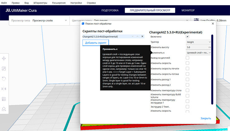 Данный скрипт вставляет свой gcode в вашу программу печати детали и позволяет изменить скорость, температуру, поток и мощность обдува в зависимости от слоя или высоты.