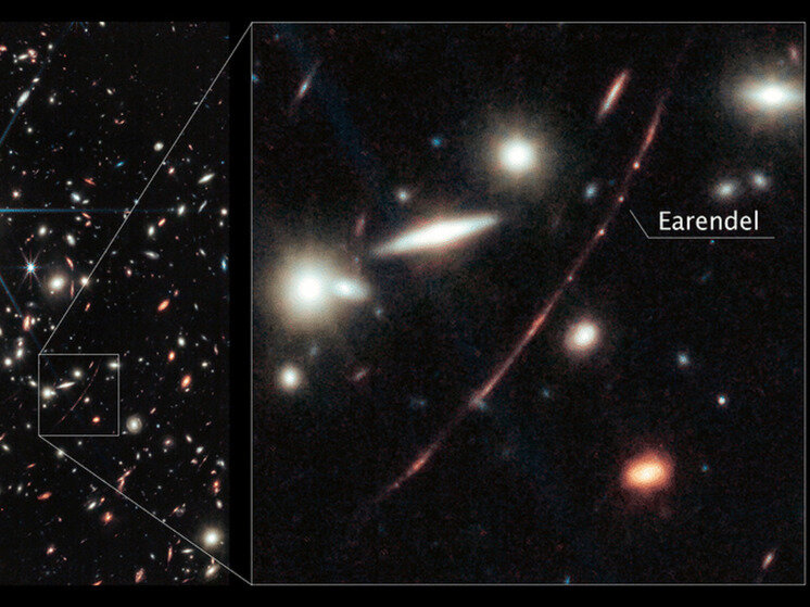 Используя телескоп Джеймса Уэбба, NASA обнаружило новости о звезде, которая является самой далекой известной звездой во всей Вселенной. Это Эарендель — особенно массивная звезда типа B, расположенная в галактике, называемой «Дуга восхода Солнца». Также известно, что Эарендель послала свой свет в космос через 900 млн лет после Большого Взрыва. Она в 1 миллион раз ярче Солнца. По данным NASA, то, что ученые вообще открыли звезду, стало возможным только благодаря сочетанию человеческих технологий и специального эффекта. Потому что без естественного увеличения, обеспечиваемого большим скоплением галактик, в данном случае WHLO137-08, которое находится на полпути между Землей и Эаренделем, звезда осталась бы невидимой для человеческого глаза. Сама масса скопления галактик заставляет пространство искривляться, действуя как естественное увеличительное стекло, через которое астрономы могут смотреть. Увеличенная в 4000 раз благодаря так называемому эффекту гравитационного линзирования, Эарендель