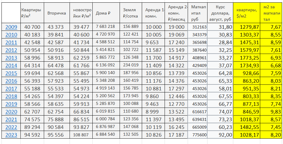 Итак, с покупкой недвижимости определились. Для более-менее ликвидной квартиры придется брать у банка сумму, значительно превышающую ту, что мы планировали. Сейчас в нашем городе можно купить однушку за 2,7 млн. рублей: маткапитал 775 тыс. + накопления 225 тыс.+1700 тыс. ипотека. Ежемесячный платеж выходит примерно 17 тыс. рублей в месяц. Плюс комуслуги, около 2-3 тысяч. Итого 20 тысяч рублей ежемесячно на 30 лет. Сдавать квартиру удастся за 12-14 тысяч. И получается, что ежемесячно нужно будет докладывать около 10 тысяч рублей сверх суммы, полученной от сдачи квартиры в аренду. В общем подумали мы, подумали, и решили, что лучше на эти 10 тысяч рублей в месяц будем покупать валюту. Я сделала таблицу, по которой видно, что в разные годы за последние 14 лет стоимость квартир относительно доллара не дорожала, а даже в какие-то моменты дешевела. Поэтому предварительно будем вкладывать средства в доллары.