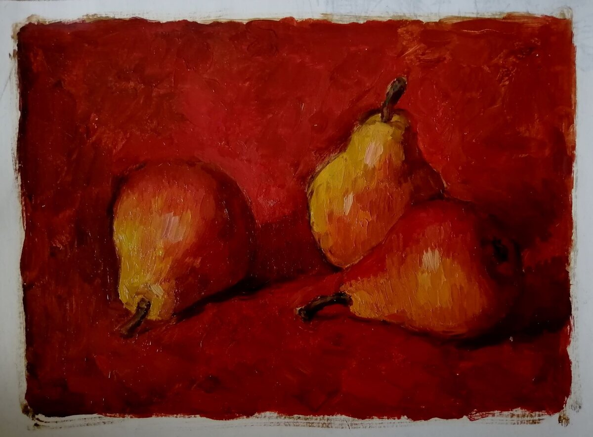 Пишем одни и те же красные груши на тёплом красном фоне и на синем: Цвета для фона здесь взяты контрастные, противоположные по спектральному кругу.