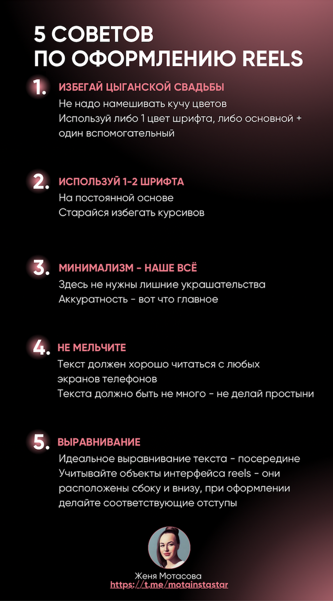 Главное: 1.ИЗБЕГАЙ ЦЫГАНСКОЙ СВАДЬБЫ - не надо намешивать кучу цветов - используй либо 1 цвет шрифта, либо основной + один вспомогательный 2.ИСПОЛЬЗУЙ 1-2 ШРИФТА - на постоянной основе - старайся избегать курсивов 3.МИНИМАЛИЗМ - НАШЕ ВСЁ - здесь не нужны лишние украшательства - аккуратность - вот что главное 4.НЕ МЕЛЬЧИТЕ - текст должен хорошо читаться с любых экранов телефонов - текста должно быть не много - не делай простыни 5.ВЫРАВНИВАНИЕ - идеальное выравнивание текста - посередине Больше советов, практик и рабочих схем по продажам в моем тг-канале, переходи по ссылке и подписывайся https://t.me/motainstastar