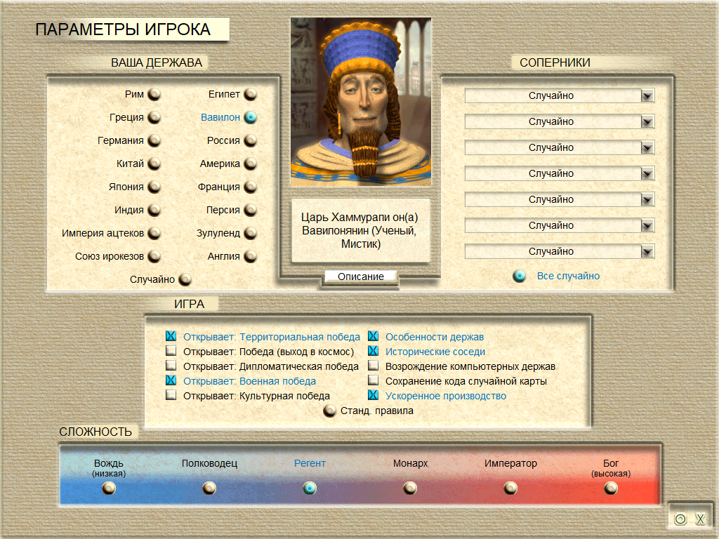 Ещё одна из моих любимых держав. Т.к. имеет 2 прекрасных бонуса. 1. Во время перехода на другие формы правления не надо терпеть революцию. 2. На каждой эпохе дают бесплатную технологию. Начальные технологии тоже не плохие: погребальный отряд и бронзовое литьё. Бронзовое литьё даёт строить нам копейщиков, а погребальный отряд даёт нам строить храмы + мистики быстро строят храмы. Особый юнит - вавилонский лучник (заменяет лучника) хорош для атаки, но не для защиты, поэтому стоит ставить копейщиков для защиты отряда (2-3 на один отряд). Устаревает на технологии изобретательство (средневековье). На пангее и континентах играть хорошо, а на островах так себе.
