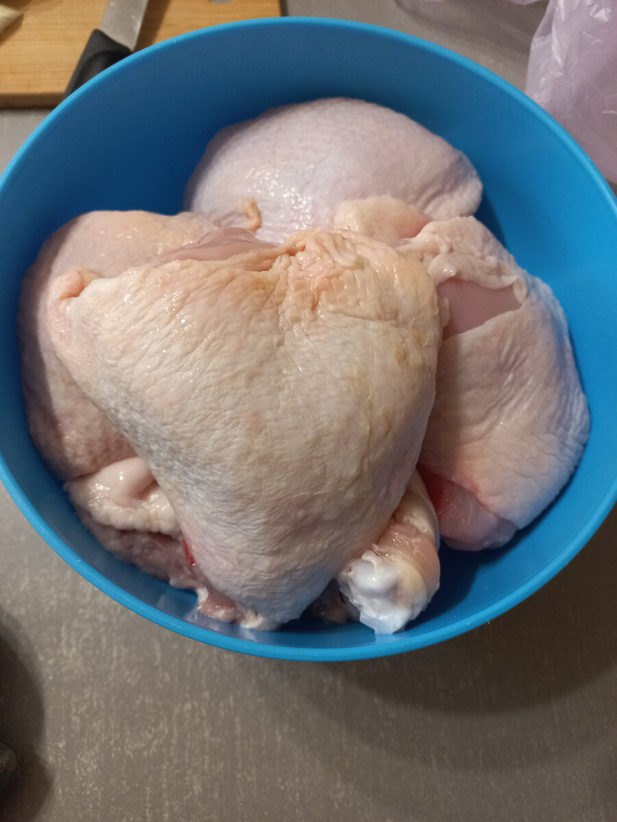 По своей натуре, я, человек не ленивый. Но, иногда так не хочется заниматься готовкой еды, хоть ляснись. На кого можно переложить эту проблему, правильно на духовку. Но некоторые движения все-таки придётся выполнить. Вот про эти движения я расскажу и покажу ниже. Исходим из того, что в холодильнике есть куриные бёдра, а в месте для хранения овощей картофель. Ну и минимальный набор специй. И ещё, если вы хотите поужинать, то подготовку лучше провести утром, или в крайнем случае в обед. Это обусловлено тем, что мясу и картофелю необходимо промариноваться. Поехали! Достаём куриные бёдра, у меня из 9 штук, это около 2-х килограмм, никакой конспирологии, далее увидите почему, и складываем в тару для маринования. Для маринования нам понадобятся: Это мой маринад, вы можете использовать тот маринад, который вы используете для маринада шашлыка. Ввё перемешиваем. Весь процесс маринования занял 5 минут. Отправляем в холодильник на 4-8 часов. Далее чистим и режем картофель средними кусочками, скла