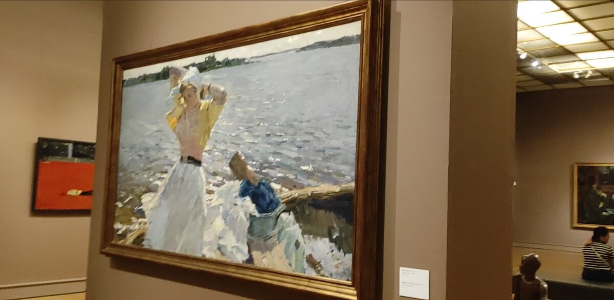 Гаврилов закончил академию имени Сурикова . Затем художник работал при мастерской им Грекова. Владимир Николаич Гаврилов мастер жанровой живопись, мне нравится его картина "Свежий ветер", про неё я и хотел вам сегодня рассказать. Был недавно на выставке Гаврилова Владимира Николаевича, куда специально приехал в Третьяковскую галерею, и вам покажу, что я там увидел. Также представляю детали картины "Свежий ветер" чтобы показать как она написана. Картина написана очень живописно, в ней видно столько простора, воздуха, показана деревенская жизнь. В основном картина Свежий ветер строится на двух трех цветах, это жёлтый, синий и розовый, желтый это кофта девушки а синий колорит это река которая занимает большую площадь картины, есть ещё розовый, это часть одежды, также часть синего это белье, все эти цвета является камертоном в этой картине. А вот основные цвета здесь жёлтый и синий. Также ещё дополняют здесь зелёный цвет вводится, это тёплый зелёный на заднем плане, ну это не основ