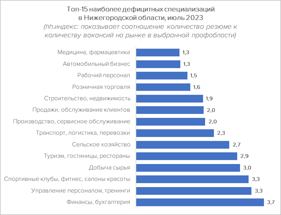 В Нижегородской области рейтинг самых дефицитных специалистов июля возглавили фармацевты, врачи и представители автомобильного бизнеса — на одну вакансию приходится 1,3 резюме, что говорит об острой нехватке соискателей. Об этом сообщает hh.ru. Еще двумя отраслями, где резюме открыто меньше, чем вакансий, стали рабочий персонал и розничная торговля — по 1,5 и 1,6 резюме на вакансию). Нижегородские предприятия региона остро нуждаются в синих воротничках, сегодня эту категорию вполне можно назвать производственной элитой, в том числе и с точки зрения предлагаемых зарплат. В каждой третьей вакансии для рабочего персонала сегодня указана зарплата на 20 тыс. выше, чем средняя по рынку, а в каждой шестой — в два раза выше средней, — отметила директор hh.ru по Нижегородской области Ольга Брылёва. Справка Уровень дефицита кадров определяется через соотношение количества резюме к количеству вакансий, при этом комфортной для рынка труда нормой считается баланс 5,0-8,0 резюме на одну вакансию, чт
