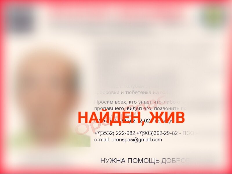 В Оренбургской области сотрудники полиции и ПСО «ОренСпас» устанавливают местонахождение жителя села Бикимурзино. Валиев Ринат 1966 года рождения пропал 8 августа 2023 года. Он ушёл из дома в селе Бикмузино и пропал. До настоящего времени местонахождение мужчины неизвестно. Приметы: рост около 180 см., худощавого телосложения, волос на голове нет, глаза карие. Был одет: голубая рубашка, чёрные штаны, кроссовки и тюбетейка на голове. Всех, кто что-либо знает о местонахождении пропавшего или видел его, просят позвонить по телефонам: 02, +7 (353335) 2-12-02 — полиция, +7(3532) 222-982,+7(903)392-29-82 — ПСО «ОренСпас». По данным на 17 августа, мужчина найден живым.