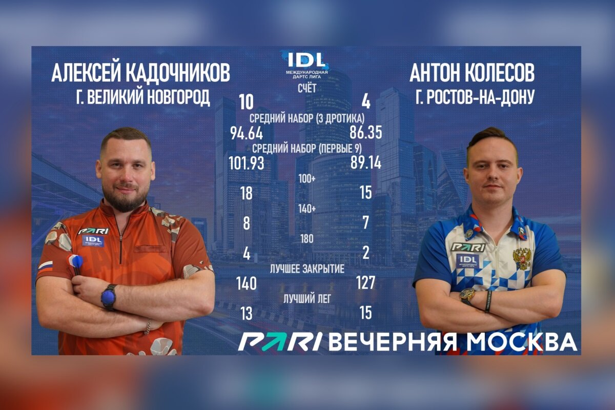 В финале PARI «Вечерняя Москва» Алексей Кадочников обыграл Антона Колесова из Ростова-на-Дону. В Москве завершился турнир Международной Дартс Лиги матчи PARI «Вечерняя Москва». У мужчин лидерство по олимпийской системе оспаривали 128 лучших метателей дротиков из России и ближнего зарубежья. Обыграв поочередно шесть соперников, обладателем главного приза турнира стал мастер спорта Алексей Кадочников из Твери, который в настоящее время представляет Великий Новгород. В финальном поединке в прямом эфире «МАТЧ! АРЕНА» Кадочников обыграл Антона Колесова из Ростова-на-Дону. – Лёша в любой момент может прибавить за счёт большого запаса и выдать сумасшедшую игру, – поделился своим мнением о чемпионе «Вечерней Москвы» известный российский дартсмен Николай Михалин. Добавим, Алексей Кадочников выиграл третий из трех именных турниров Международной Дартс Лиги. В календаре МДЛ запланировано проведение в 2023 году пяти таких турниров. Всего в текущем сезоне Кадочников выступил в шести финалах соревнов