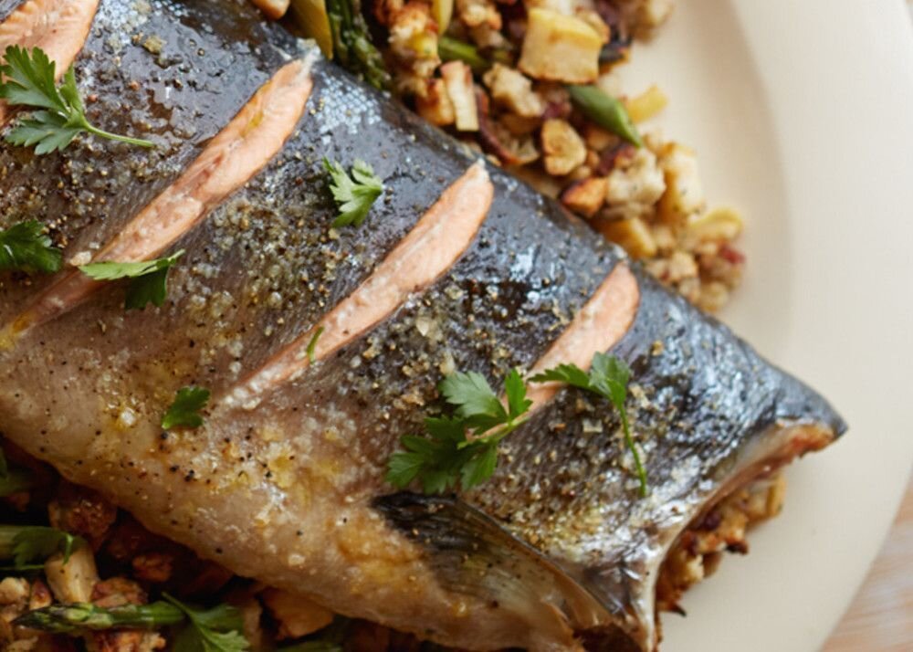 Тушка рыбы должна быть выпотрошена и очищена изнутри от черной пленки. Также нужно делать на спинке три-четыре надреза. Натереть солью и специями. Лучше всего использовать готовую приправу, но если под рукой не окажется – смешайте молотый черный перец с мелко нарезанной лимонной цедрой: этого будет вполне достаточно.