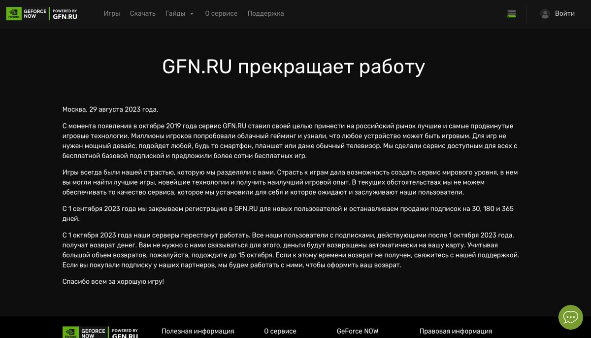 Сервис GFN.RU сообщил о прекращении своей работы с 1 октября 2023 года. Причину произошедшего они объясняют следующей фразой: "Игры всегда были нашей страстью, которую мы разделяли с вами. Страсть к играм дала возможность создать сервис мирового уровня, в нем вы могли найти лучшие игры, новейшие технологии и получить наилучший игровой опыт. В текущих обстоятельствах мы не можем обеспечивать то качество сервиса, которое мы установили для себя и которое ожидают и заслуживают наши пользователи." Ссылка. Источники: Wylsacom; GFN