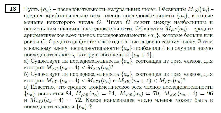На пробном ЕГЭ в декабре в номере 18 была такая задача: Условие этой задачи мало кто из учеников смог понять и из-за непонятой формулировки не стали за нее даже браться. Другой вариант этой задачи: Несколько джентльменов-бесконечнодолгожителей образовали клуб. Возрастом джентльмена считают полное количество прожитых им лет. Тех джентльменов, которым не менее 79 лет, называют «стариками», а тех, кому менее 79 лет – «юнцами». Состав клуба никогда не меняется, в нём есть хотя бы один «юнец» и хотя бы один «старик». а) Может ли в клубе из трёх джентльменов случиться так, что ровно через четыре года средний возраст «юнцов» уменьшится? б) Может ли в клубе из трёх джентльменов случиться так, что ровно через четыре года одновременно уменьшатся средний возраст «юнцов» и средний возраст «стариков»? в) Средний возраст всех членов клуба равен 84. Средний возраст «юнцов» 70 лет, средний возраст «стариков» - 92 года. Через 4 года средний возраст «юнцов» стал равен 72 годам, а средний возраст «старик