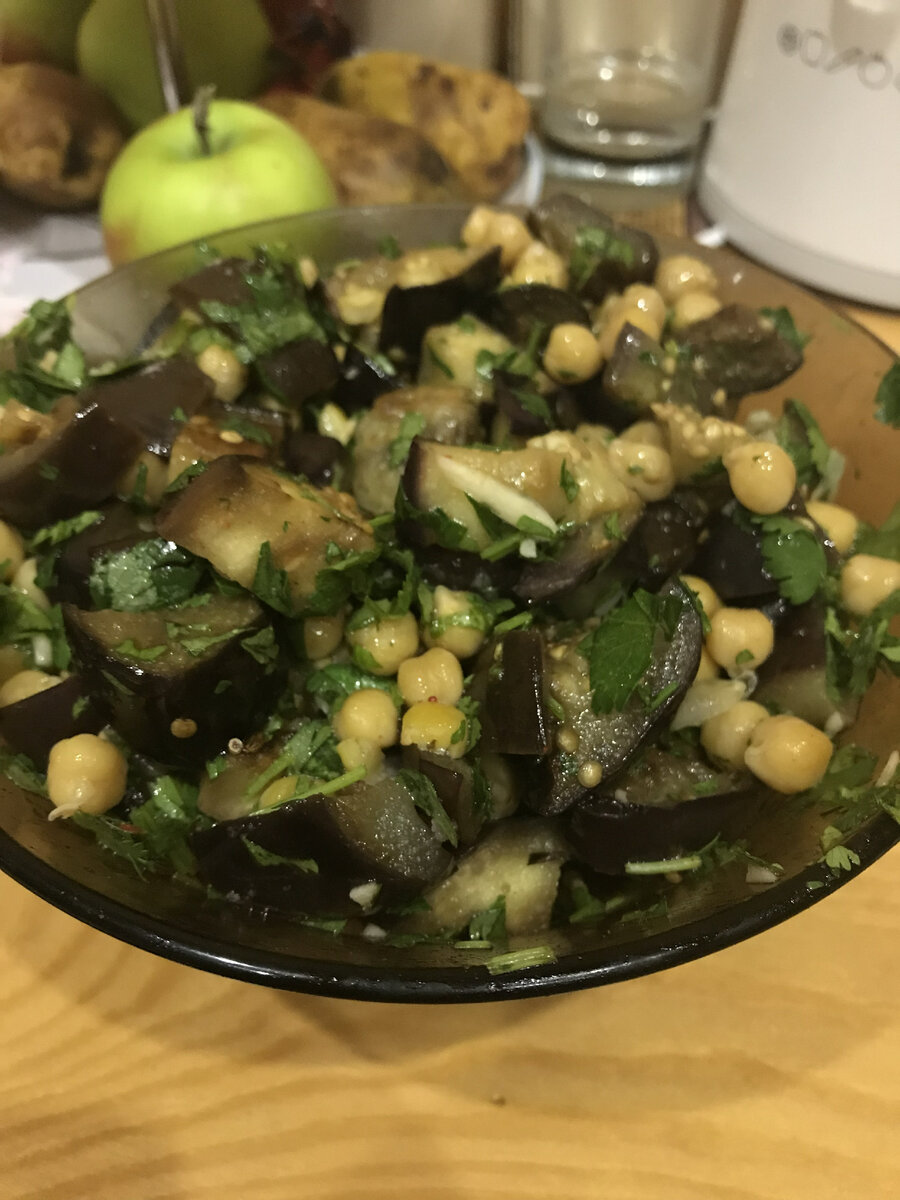 4.Нут, баклажаны и заправку смешать, посолить. Дать настояться в холодильнике часа 2.