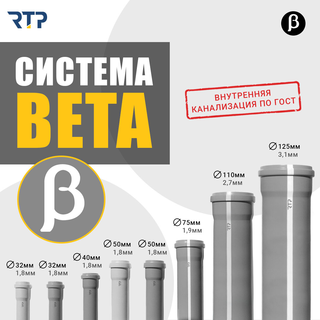 Система «Бета» от RTP – это трубы и фитинги внутренней канализации выполненные в сером цвете по ГОСТ 32414-2013. Линейку отличает: