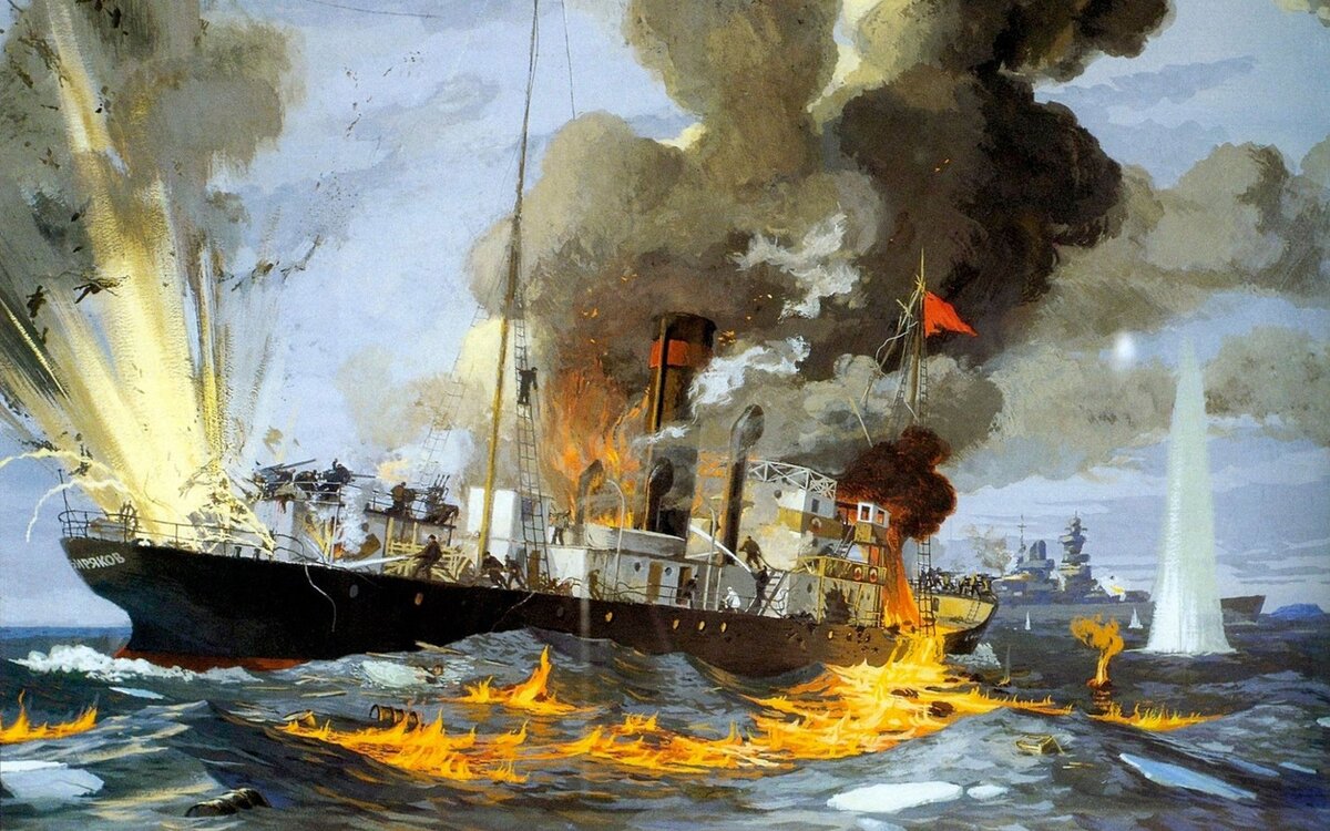 В первые же минуты были снесены два кормовых орудия, убиты 32 человека прислуги с их командиром С.Ф. Никифоренко. Упала носовая мачта, оборвав антенну. Начался пожар...А.Г. Шаршавин еще успел передать в эфир последнюю радиограмму: «Горим, прощайте. 14 часов 05 минут». В неравном бою «Сибиряков» был потоплен.