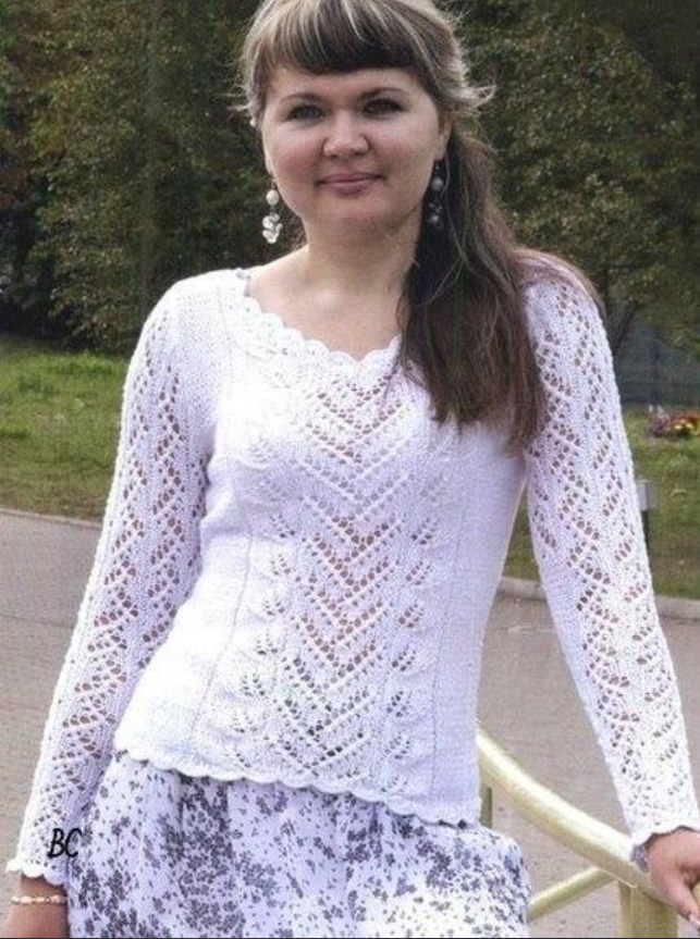 Геометрические мотивы переплелись с ажурными листочками. Получилось очень интересное сочетание узоров. На фоне белой пряжи узоры смотрятся особенно выразительно. Обвязка низа пуловера, рукавов и горловины выполнена крючком.