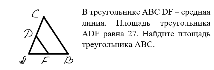 Рассмотрим решение следующей задачи: Вспомним, что такое средняя линия треугольника, и что она делает. Ответим на рисунке равные отрезки и запишем условие задачи Решение 1) Рассмотрим треугольники AFD и ABC. 2) Найдем коэффициент подобия 3) Так как нам необходимо найти площадь треугольника АВС, зная площадь AFD, то нам понадобится теорема об отношении площадей двух подобных треугольников. Поблагодарить легко! Буду весьма признателен, если поделитесь этой статьей в социальных сетях, поставите лайк и подпишитесь на мой блог