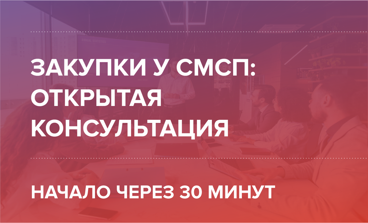Начало вебинара через 30 минут в 13:00 (МСК) на тему: «Закупки у СМСП: открытая консультация»