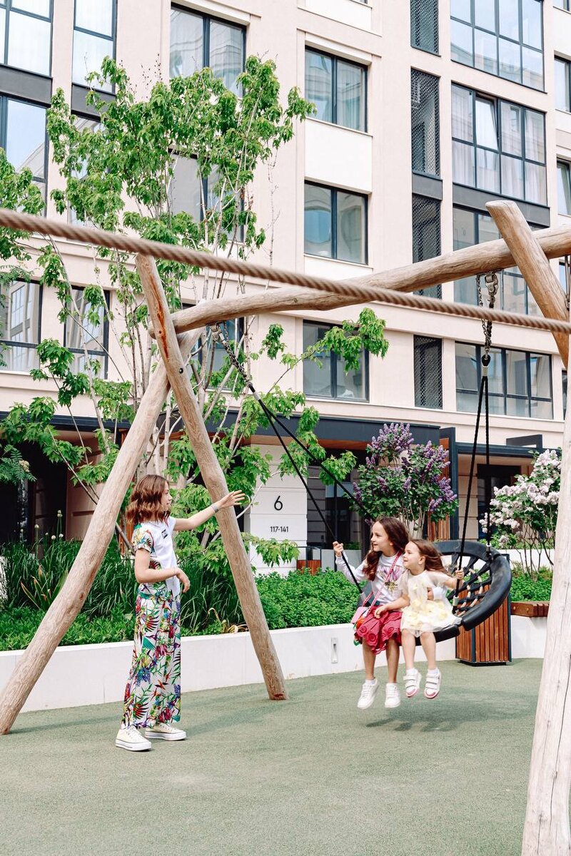В таком дворе высота каждого элемента и материалы покрытий выбраны не случайно. Они учитывают принцип контролируемого риска игры. Это значит, что ребенок находится в безопасности, но учится осознавать свои способности. Взять ту же амплитуду качелей: она задана так, чтобы быть комфортной, но в то же время достаточной для хорошей раскачки. Еще одна деталь: наличие в каждом дворе лазалок и веревок. Для чего? Ответ: для развития мелкой моторики. Дворы проектов Forum наполнены неочевидными, но важными деталями, которые влияют на качество досуга. На фотографиях — примеры детских площадок в ЖК Александровский сад. Важно и общее разнообразие: элементов на площадке достаточно много, чтобы дети могли проявлять фантазию, комбинировать игровые сценарии и развивать творческие способности. На площадке будет комфортно и родителям – рядом всегда есть беседки, чтобы общаться и присматривать за детьми. Все игровые элементы сделаны из экологичных материалов. Они отлично вписываются в озелененный двор и п