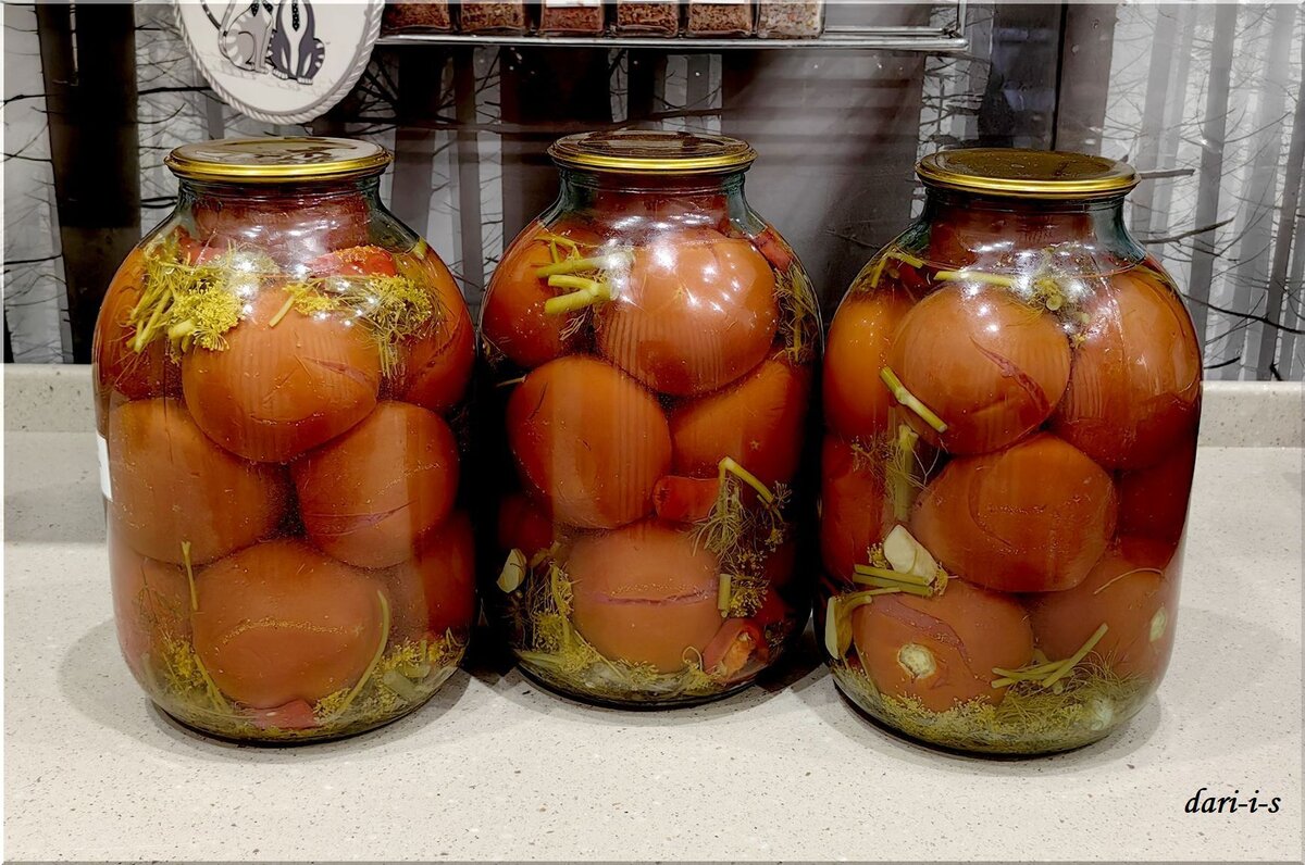 Эти помидоры понравятся тем, кто хочет зимой ощущать вкус самих помидоров с минимальным привкусом специй. Один из трёх любимых рецептов моего мужа. Нам потребуются: Моем помидоры и банки. Укроп режем средне, зубчики чеснока разрезаем на 4 части, острый перец вместе с семенами - кружочками по 1-1,5 см (если класть перец целиком, он плохо отдаёт свой вкус и получится пресновато). В каждую 3 л банку кладём на дно: Укладываем плотно помидоры (кроме самого верхнего - его мы положим сверху специй), сверху снова добавляем специи: Прижимаем последним помидором. Кипятим маринад. На 1,5 л воды: Заливаем кипящим маринадом помидоры. Стерилизуем банки с содержимым, прикрыв крышками, 7-8 минут с момента закипания воды в кастрюле. Закручиваем, переворачиваем, укутываем на сутки. Готово. P.S. У меня некоторые помидоры треснули - это не влияет на вкус, но можно уменьшить это явление, если перед укладкой прокалывать плодоножку зубочисткой. Если Вам понравилось, ставьте лайки и подписывайтесь. Вас ждет е