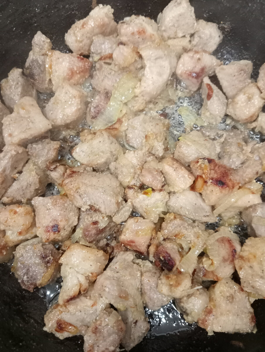 Когда жидкость выпарилась, добавляем вторую луковицу, нарезанную кольцами, полукольцами или перьями (как больше любите), добавляем растительное или сливочное масло и уже на хорошем огне, периодически помешивая, обжариваете до румяности мяса и лука.
