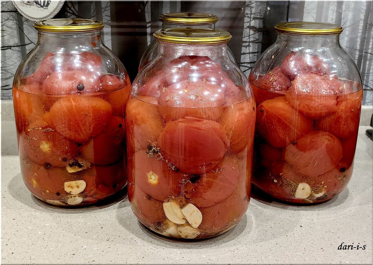 Готовлю эти помидоры не первый год. Одни из самых любимых в семье. Получаются с насыщенным вкусом и нотками специй, немного острые. Объедение! Нам потребуются: Моем овощи и банки. У меня на указанное количество помидоров ушло 4 банки по 3 литра. В каждую 3 л банку кладём на дно: Помидоры складываем в глубокие кастрюли и заливаем крутым кипятком на 20-30 минут. Потом не сливаем воду, а достаём помидоры по очереди и очищаем от кожуры (плодоножки не надо вырезать). Сразу максимально плотно закладываем в банки. Сверху кладём (я обычно оставляю место для верхнего помидора, кладу специи и потом прижимаю последним помидором): Рассола нет, помидоры будут в собственном соке. Заполненные банки стерилизуем ровно 45 минут, накрыв крышками. Помидоры осядут - ничего страшного. Закручиваем, переворачиваем, укутываем на сутки. Готово. Если делаете в большом количестве, то можно из одной банки после стерилизации переложить помидоры в остальные для заполнения пространства в банке, но это совсем не обяз