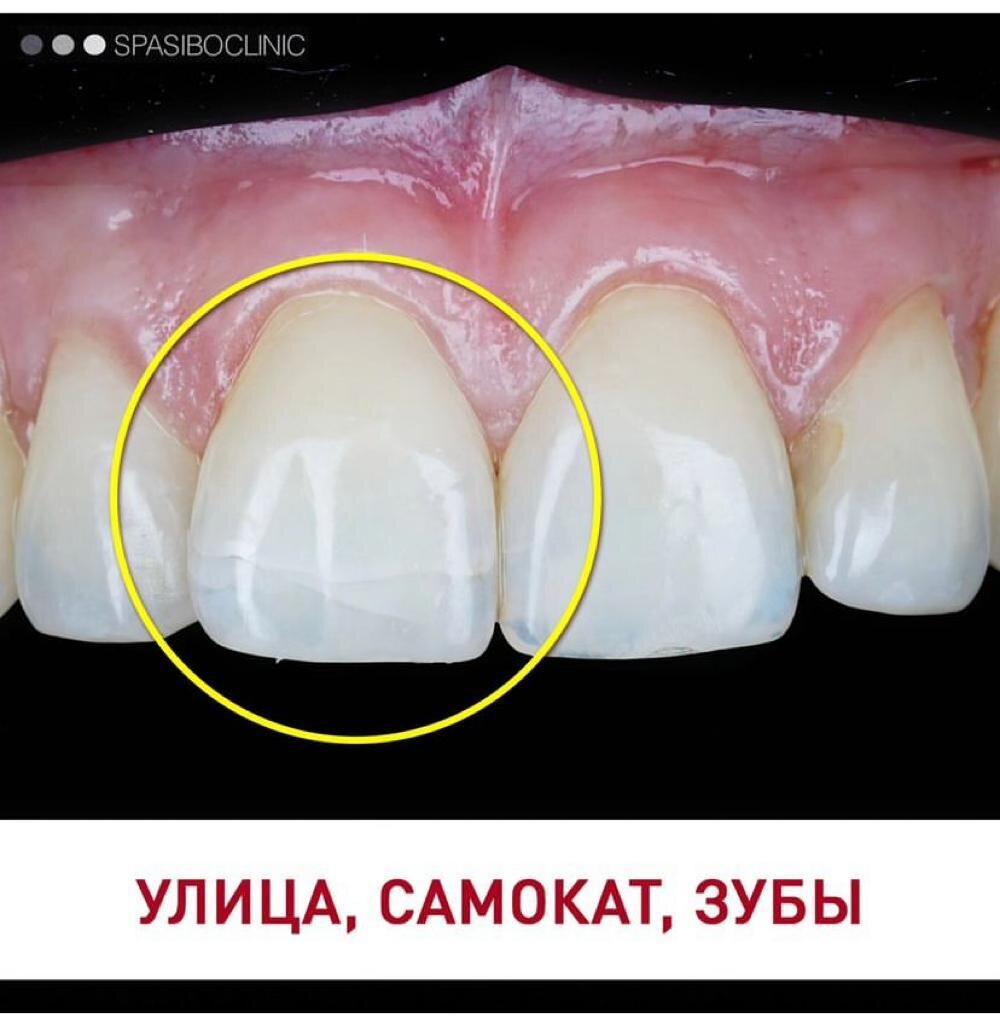 Девушка каталась на самокате и упала, удар пришелся на передние зубы. Ничего ужасного, зубы живы, но остались трещены.