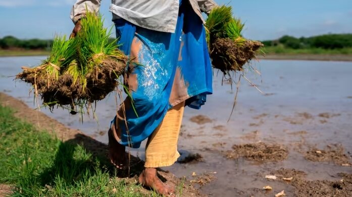 Женщина несет саженцы риса для пересадки в южном штате Андхра-Прадеш, Индия. Сильные дожди вынудили Индию запретить экспорт белого риса, исключая басмати © Rafiq Maqbool/AP