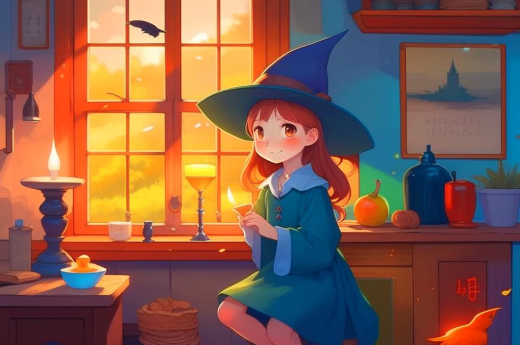 Каждое утро, когда солнце только начинало приподниматься над горизонтом, маленькая ведьма Алиса с нетерпением просыпалась. Ее день начинался с улыбки, ведь перед ней открывались новые школьные приключения. Алиса надевала свою яркую звездную шапочку, которая сверкала магическими знаками, и брала в руки свой верный магический посох. Он был немного больше ее самой, но Алиса всегда носила его с гордостью, как символ своей будущей магической силы. Под ее шагами тропинка к школе магии сверкала разноцветными искрами, будто земля приветствовала ее на пути. Друзья из соседних домов махали ей рукой, улыбаясь, так как они знали, что Алиса всегда поднимает настроение окружающим. В школе, где учили молодых ведьм и волшебников, Алиса была всегда центром внимания. Ее яркий наряд и озорной взгляд привлекали внимание, но самое главное – это ее способность поддерживать дружеские отношения. Она всегда помогала своим одноклассникам, делая легкие шутки и распространяя радость. На уроках магии Алиса с интер
