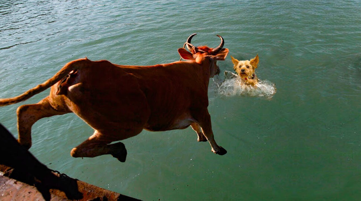 Корова, увидев, что дед бросил собаку в воду, не смогла остаться в стороне и нырнула прямо туда
