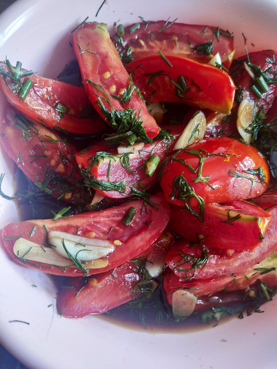Иногда хочется побаловать себя чем- то вкусным, как быть, когда нельзя по диете или по иным причинам? Я расскажу, какую закуску из помидоров я придумала. Это маоосольно- мало- маринованные помидорки. В них минимум соли. Простые приправы. Короче, рассказываю. Нам потребуется: - помидоры( любые, какие есть)-500 гр - чеснок-3 зубка - укроп- 1/2 пучка - соль, крупная-1 чайная ложка, нг можно уменьшить Для заливки: - соевый соус - 2 чайные ложки - рыбный соус -1 чайная ложка, если нет рыбного соуса, можно его не добавлять или заменить чайной ложкой любого душистого масла - рисовый ( или яблочный, или винный) уксус-2 столовые ложки Если заливка вам покажется недостаточной, можно добавить воды, соевого и уксуса на свой вкус. Я воду не добавляла, мне хватило жидкости, которую дали помидоры. Как делать: 1.Помидоры режем дольками, как на фото. Засыпаем солью. Перемешиваем, даем постоять минут 30 под пленкой. 2. Режем тонко чеснок, не давим, именно режем такими пластиночками. 3. Режем мелко укро