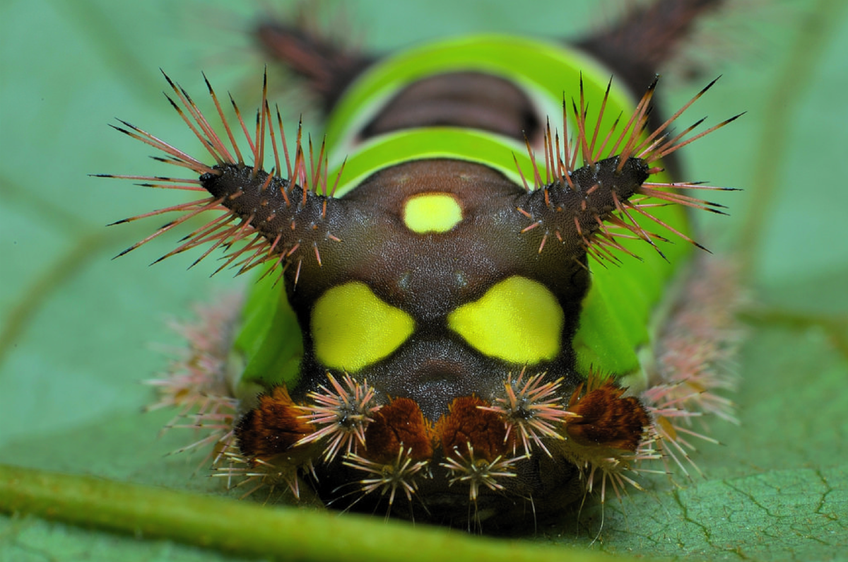 Эти причудливые гусеницы ( личинка моли Acharia stimulea), длина которых достигает 2,5-3 см, относительно распространены в своём обширном ареале, который простирается через восточную половину Северной Америки, а также в Мексику. Седловидную гусеницу можно узнать по её характерным отметинам: тело коричневое на переднем и заднем концах, но середина зелёная с коричневым овалом посередине, окружённым белым контуром. Эти отметины напоминают салатовую попону на коричневом седле, отсюда и название. Питаются различными видами растений, хотя они часто предпочитают есть кустарник, известный как Линдера бензойная. Хотя для некоторых это может стать неожиданностью, гусеницы некоторых видов моли способны жалить. Некоторые исследования показали, что около 150 из примерно 160 000 задокументированных видов вызывают побочные реакции. Эти побочные реакции могут возникнуть после того, как люди вступают в прямой контакт с ядовитыми волосками или шипами гусениц, которые действуют как естественный защитный
