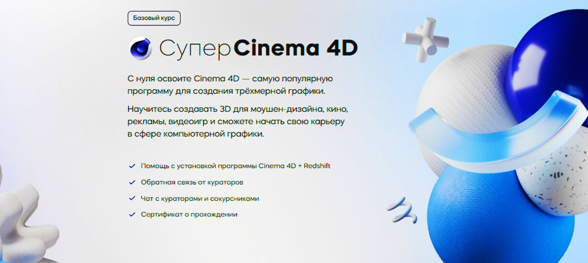 Заказать: >>> Базовый курс "Супер Cinema 4D": С нуля вы освоите Cinema 4D - самую популярную программу для создания трехмерной графики. Вы научитесь создавать 3D для моушен-дизайна, кино, рекламы, видеоигр и сможете начать свою карьеру в сфере компьютерной графики.