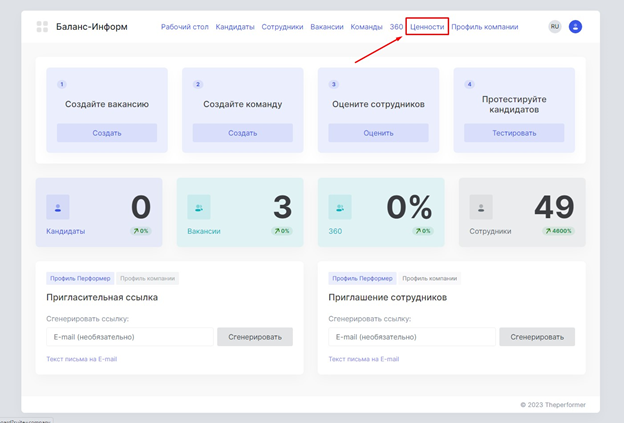 1. На главной странице в меню администратора выбрать вкладку "Ценности". 2. В открывшейся вкладке выбрать подвкладку "Формирование выборки респондентов и рассылка приглашений на тестирование", кликнуть "Открыть". 3. Создать категории участников тестирования кликнув в открывшемся окне "Выбор участников по категориям". 4. В открывшемся окне, в списке групп для тестирования, кликнуть "Добавить категорию", во всплывающем окне внести нужное название категории, кликнуть "Добавить". Аналогично добавить необходимое количество категорий. 5. Выбрать профиль, по которому будет проводится тестирование кликнув либо "Профиль Перформер", либо "Профиль компании". 6. Выбрать группы для тестирования, поставив галочки напротив групп, которые необходимо протестировать, кликнуть "Продолжить". 7. В открывшемся окне ввести электронные почты тестируемых через запятую или загрузить файл CSV. 8. При необходимости откорректировать текст письма, кликнув "Текст письма на E-mail". 9. Кликнуть "Разослать ссылки на т