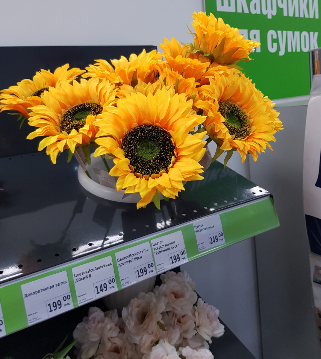 Здравствуйте, дорогие друзья! В одной из своих недавних статей показывала вам двух дам, которые выбирали искусственные цветы. Одна из них хотела цветок на длинной ножке и желательно подсолнух. Я тогда ещё подумала - подсолнухов - то тут не бывает. Оказалось, я очень ошибалась - бывает. И вот, пожалуйста🌻 Цветок искусственный Подсолнух, 80 см. - 199 руб. Хотите, чтобы лето не кончалось? Тогда купите себе это яркий подсолнух и он всегда вам будет напоминать о солнечных летних днях. Можно поставить одну ветку, а можно составить цветочную композицию с другими цветами. Было бы, конечно, красиво поставить 3 цветка подсолнуха вместе, но цена всё - таки немаленькая. Смотрите, каков красавец👍 Ещё понравилась гортензия. Здоровые разноцветные шапки . Цена 199 руб. Для удачного начала дня можно повесить магнит на дверцу холодильника с мотивирующей надписью. Цена 49 руб.50 коп. Добрые позитивные пожелания! Рядом с магнитом обнаружила игру - сувенир Рулетка - 55 руб. Пригодится для распределе