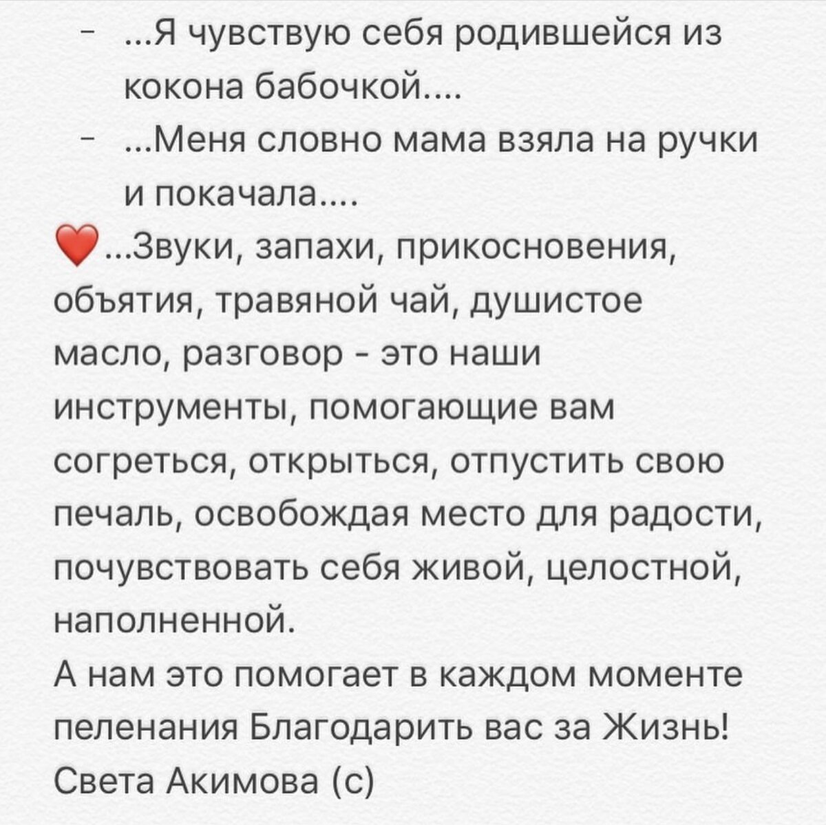 ...Меня всегда поражает, сколько приёмов использует опытная банщица. И каждый из них со своим ритмом, звуком. Тело начинает откликаться - в активные моменты хочется выдохнуть - громко, шумно, и мы присоединяемся - выдыхаем вместе с женщиной. Кто-то начинает смеяться, кто-то плакать - баня делает свою работу - много раз в парной мы слышали и смех, и слёзы.
