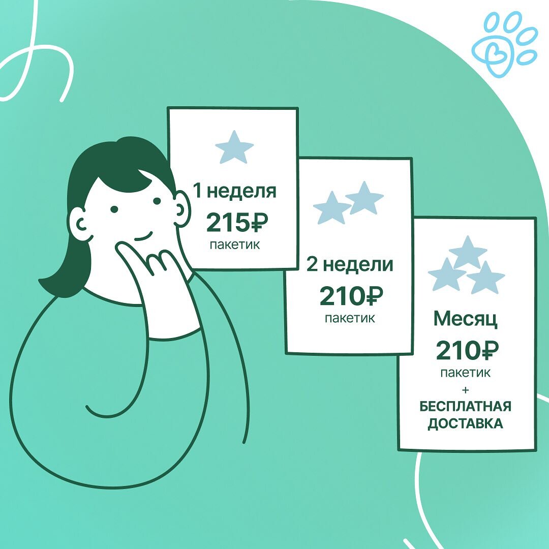 • 1 месяц от 30 пакетиков: от210₽ (за 1 пакетик + бесплатная доставка в пределах 10км от МКАД).