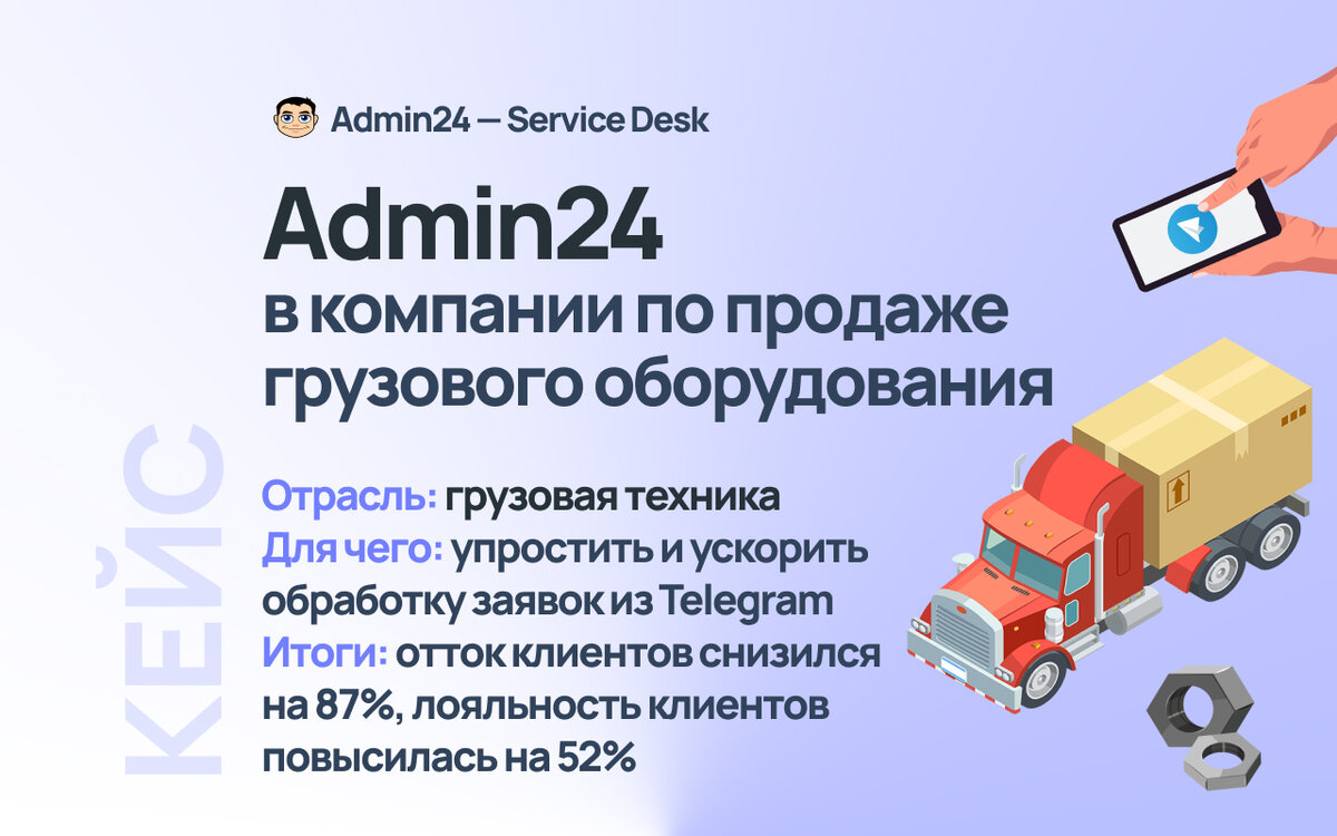 Ранее сотрудники компании долго отвечали на заявки из Telegram и регулярно их теряли. В результате лояльность клиентов была низкой, некоторые из них уходили. Чтобы ускорить обработку заявок и повысить удовлетворенность клиентов, компания внедрила Admin24 – Service Desk.