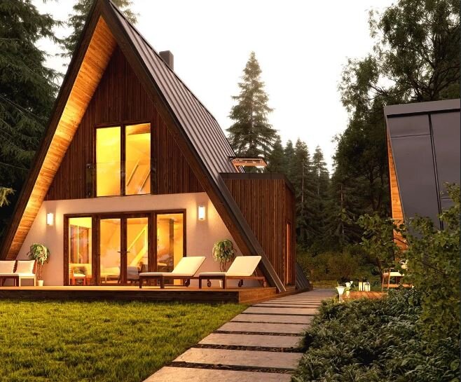 В последнее время все большую популярность начинают приобретать дома-шалаши треугольной формы, называемые А-фрейм. Данный вид домов был популярен в 50-60 годы за рубежом, и сейчас набирает свою популярность в России. В чем же секрет такого внимания к дому-шалашу? Во-первых, внешний вид очень привлекательный, он сильно выделяется среди привычных строений. Треугольная форма напоминает нам детство: либо воспоминания о сказочных домиках в лесах с волшебными обитателями, либо о походах и жизни в палатках. Такой дизайн освежает привычное восприятие и поэтому возникает желание, если не построить, то хотя бы побывать в таком доме. Во-вторых, быстрое возведение данного дома. Конструкция не является сложно, поэтому построить такой дом можно за 3 месяца. Возводиться дом на свайном фундаменте, который можно установить за несколько часов. Минусы дома А-фрейм -стены, которые являются одновременно крышей дома, съедают очень много полезной площади. Фактически дом 36 м2, не является как таковым, и при