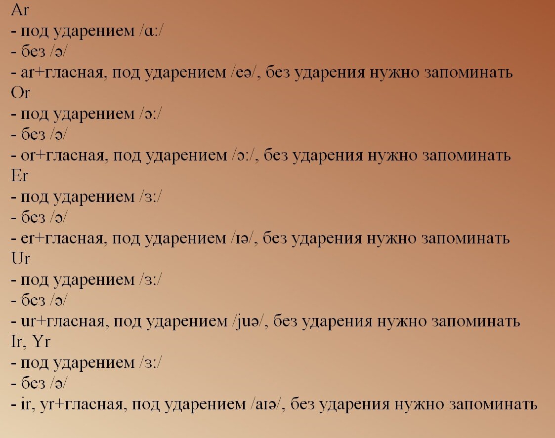 Повторим слова из предыдущего урока: I - ? Ты, Вы - ? He - ? Мы - ? It - ? They - ? Она - ? Прочитайте правильно новые слова (глаголы) с помощью правил из урока 2: to be - быть to know - знать (kn – читается как /n/) to say - сказать to have - иметь to get - получать to do - делать (частица to ставится перед глаголом в инфинитиве (отвечает на вопрос «Что делать?») Сегодня поговорим о букве r немного поподробнее, так как для чтения гласных с ней также существуют правила. Данная буква в британском английском в этих сочетаниях не произносится и не пишется в транскрипции, а вот в американском английском она есть, но для ее правильного произношения нужно потренироваться. (из этих правил есть небольшое исключение, ar/or/er/ur/ir/yr+y, то ry ,будет произноситься) И так же несколько правил с другими согласными: - Согласная + le, если перед le стоит одна согласная слог открытый, ес