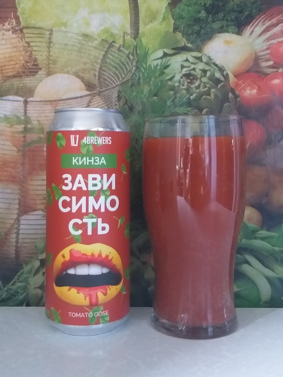 Сегодня я хочу рассказать читателям моего канала о пиве от владимирской крафтовой пивоварни 4BREWERS. Линейке томатных гозе "Зависимость" уделялось достаточно внимания на канале. В разное время вышло несколько обзоров про "томатки" из этой серии. Вот ссылка для просмотра этих и других материалов о пиве от 4BREWERS. На очереди обзор ещё одной "томатки" из этой серии. "Зависимость [Кинза]" Пивной напиток непастеризованный нефильтрованный неосветленный "Гозе 5" Состав: вода подготовленная, солод пивоваренный ячменный, томатная паста, кинза, хмель прессованный, дрожжи пивные, лактоза, соль поваренная пищевая, сорбат калия (Е202). Объем: 0,5 л. Изготовитель: ООО "Четыре пивовара" (г. Владимир) Цена: 269 рублей Дата розлива: 21.07.2023 Дегустация: Август 2023 года Так как кинза входит в состав пивного напитка, то веточки кинзы нашли своё отражение на этикетке. В остальном это привычный дизайн для серии "Зависимость" - традиционные жёлтые губы, испачканные томатной пастой, на красном фоне. Цв
