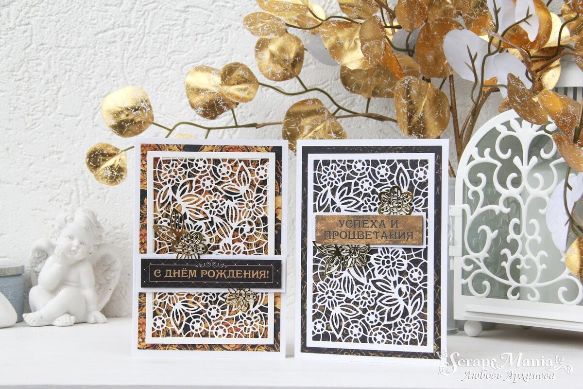 Всем привет! Сегодня с вами я, Любовь Архипова. Ко мне в руки попала очень красивая коллекция TM ScrapMania "Элитный клуб". Очень необычная палитра и принты. Мне захотелось попробовать сделать с ней что-то интересное. У меня получились две открыточки в стиле CAS. Мне в этом помогли красивые ножи тоже TM ScrapMania. Черно-золотая гамма очень выигрышно подчеркнула вырубной узор белого цвета, а золотые детали из зеркального картона придали открыткам лоска и блеска, стали красивым акцентом. По формату открыточки 17х12 см, в каждой есть кармашек для денежки и памятных надписей. На создание открыток мне пригодились два листа из набора бумаги 30,5х30,5 см "Элитный клуб", две вырубки ножом "Кружево. Цветы сказочные. Фон" и несколько вырубных цветочков из зеркального картона ножом "Кружево. Цветы сказочные. Акценты". Надписи я взяла с лист с картинками 10х30 см "Элитный клуб. Надписи". Нож "Кружево. Цветы сказочные. Акценты" достаточно большой и ажурный, и чтобы вырубить весь узор, этот нож нуж