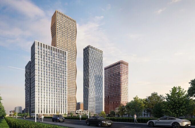 «Каждое из зданий по-своему выделяется. Внимание сразу привлекают две башни, которые держат основные градостроительные оси — улицу Новопесчаную, 3-ю Песчаную и улицу Куусинена. Структурный графичный антрацитовый фасад башни D2 и латунно-золотистые наклонные плоскости скульптурной башни D1 создают пару, контрастную по архитектуре и силуэту. Более низкие объемы корпусов А, В, С выглядят менее монументально, но живописно – их фасадные паттерны с разных ракурсов создают необычные сочетания»