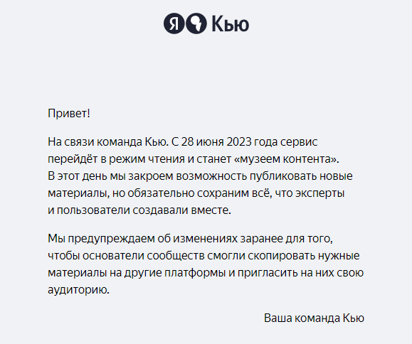 Яндекс Кью переходит в режим чтения и становится музеем контента. Руководитель платформы Яндекс Кью, Сергей Юдин, объявил о том, что с 28 июня сервис изменит свой статус на режим чтения: нельзя будет задавать вопросы, писать ответы, а также создавать посты и опросы в сообществах. За 4 года Яндекс Кью смог создать уникальное сообщество экспертов и пользователей, которые обменялись знаниями и опытом. Не закрывая платформу, команда Кью берет “паузу” для того, чтобы “подумать” над будующим развитием проекта. Все страницы и записи по-прежнему останутся доступны, поиск продолжит работать, а в сообщества и на страницы пользователей можно будет вернуться за интересующим материалом. Если возникнут вопросы, служба поддержки готова помочь в решении проблем. Пока же Яндекс Кью желает поблагодарить всех за участие и доверие в этом проекте. Почему так произошло Некоторые пользователя связывают закрытие нормального режима работы сервиса “Яндекс.Кью” тем, что сейчас активно развиваются нейросети, кото