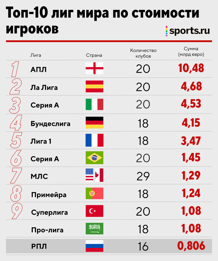 Суммарная стоимость всех футболистов чемпионата Саудовской Аравии пробила миллиард евро. Про-лига теперь в первой десятке лиг. Хотя до летней закупки все было намного скромнее. Саудовская лига уже заметно дороже РПЛ. Догнала Турцию Так выглядит рейтинг самых дорогих лиг мира по трансферной стоимости игроков, суммы – по Transfermarkt: ● Лидерство АПЛ не удивляет, там даже два отдельных клуба («Манчестер Сити» – 1,24 млрд и «Арсенал» – 1,21) стоят больше, чем вся саудовская лига (1,02). Отрыв настолько велик, что две следующие лиги вместе взятые (Испания и Италия) отстают от АПЛ более чем на миллиард. ● Больше 27 миллиардов – совокупная стоимость всех топ-5 лиг Европы (пятой мы, конечно, по традиции считаем Францию). Во второй пятерке каждая из лиг стоит не более полутора миллиардов. МЛС, кстати, можно вынести за скобки – там гораздо больше клубов. В Бразилии выделяются «Палмейрас» (163 млн) и «Фламенго» (161 млн), в Турции самые дорогие – «Галатасарай» (227 млн) и «Фенербахче» (211 млн)